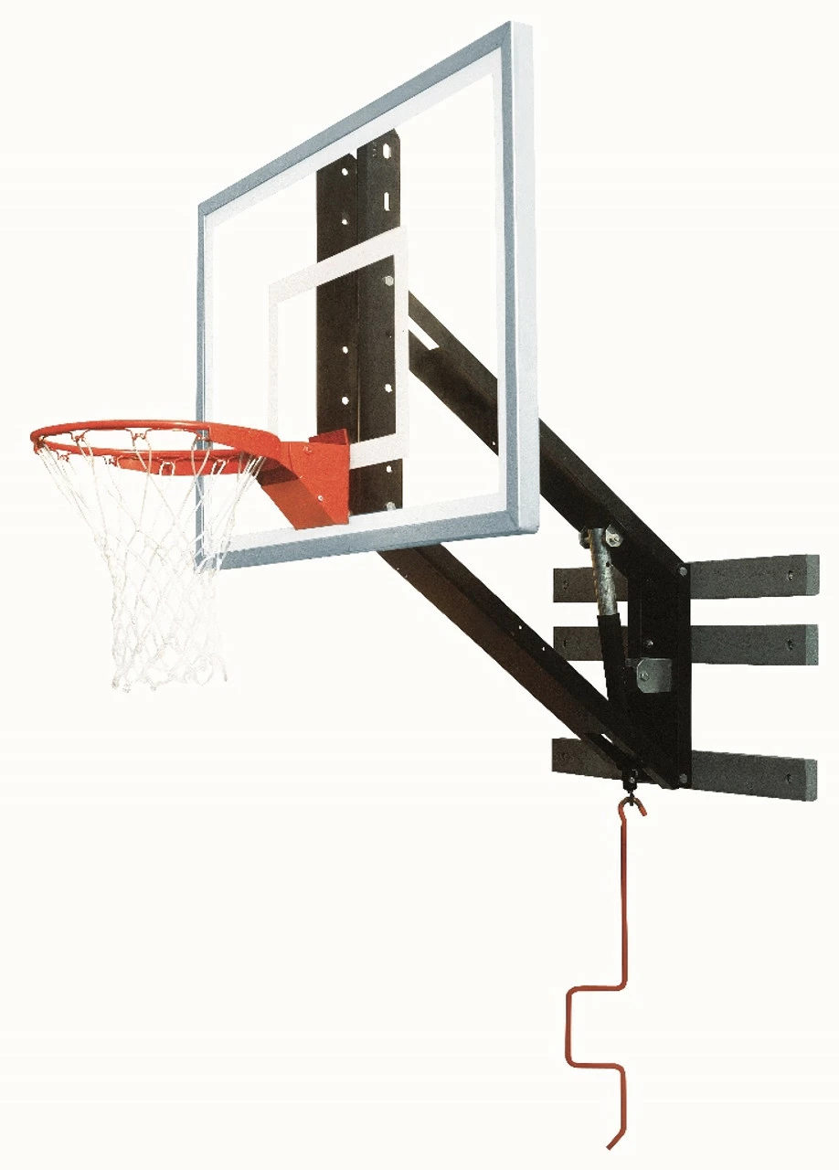 Bison’s ZipCrank Adjustable Wall Mounted Basketball Hoop is a low cost indoor or outdoor option for your home or gym. This hoop comes with a 36 inch x 54 inch rectangular tempered glass backboard and an official size flex goal that can be infinitely adjusted from 10 feet down to 7½ feet from the floor with a removable hand crank. The rim is direct mounted to the steel support structure to eliminate excess stress on the backboard. The backboard extends 30 inches from the wall at 10 feet. Bison’s ZipCrank Adjustable Wall Mounted Basketball Hoop comes with a five year limited warranty.