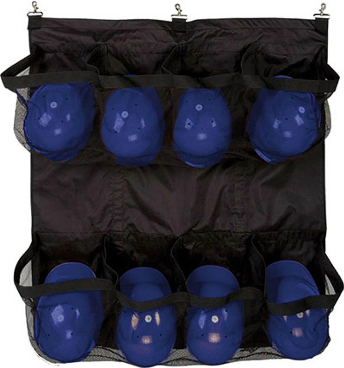 - Holds eight helmets separated into individual mesh pockets for easy storage