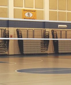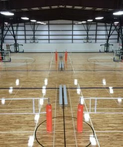 The one-court system comes with one 4″ O.D. master telescopic upright, one 4″ O.D. master telescopic upright with winch, two 4″ floor sleeves, two swivel brass or chrome cover plates, one competition net, one pair of antennas and sideline markers, two upright safety pads and one set of four cable covers. Upright pads come in a variety of colors.