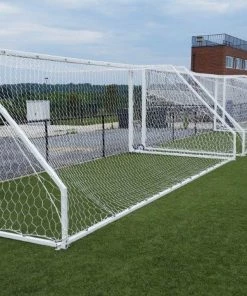 Score with Gared’s new and improved line of Touchline Aluminum Soccer Goals. Constructed of extruded aluminum, the frame is lightweight for ease of assembly and transport. Heavy-duty 1-5/8″ galvanized steel backstays and adjustable one-piece ground bar adds counterweight and stability to the goal. The welded one-piece goal frame corners provide strength and rigidity with no visible hardware. The crossbar and uprights contain a channel along the backside of the goal for easy and secure net clip insertion, and are powder coated white for protection against weather elements. Each goal includes one crossbar and two uprights, two backstays, one-piece ground bar, net attachment clips, four 14″ steel ground stakes, net and hardware. For portable goals, we recommend adding optional underground anchors to decrease risk of goal tipping over. An optional wheel adapter kit is available to allow easy transport of portable goals. Touchline All-Star Soccer Goals are sold in pairs; nets are included. The 8′ x 24′ size is approved for competition play and meets NCAA, NHSAA, and FIFA specifications. All goals come with Gared’s 8 year limited warranty.
