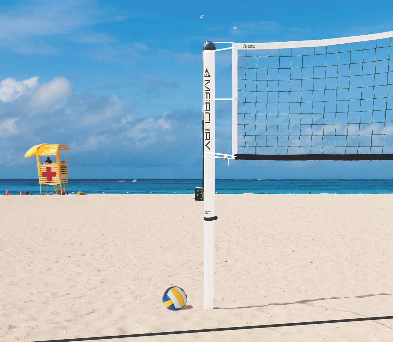 Jaypro’s new line of Mercury beach volleyball systems are designed for competitive beach volleyball play. The Mercury Aluminum Official Beach Volleyball System is a lightweight but durable system. The Mercury System is available with a professional 28′ long net or a 32′ long net. The 28′ long version meets all NFHS, NCAA, USVBA, and FIVB requirements. The net is 39″ high for both versions. This system includes 3-1/2 inch powder-coated aluminum uprights that utilize an inverted telescoping design to provide adjustability while preventing sand and water from getting in where the two sections meet. Carbon reinforced cap and carbon fiber collar provide further protection against sand and water. The net height can easily be adjusted from 5 Feet 6 Inches to 7 Feet 11-5/8 Inches to allow for a variety of play levels. The Mercury Aluminum Official Beach Volleyball System comes with two uprights, an official competition net, winch and antennae. Ground inserts designed for sand are available at additional cost. You also can add a custom net tape to personalize your volleyball system.