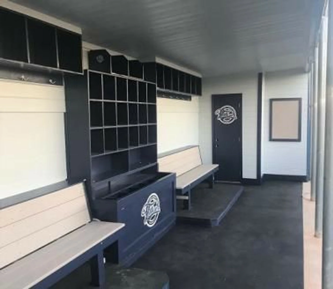 - Optional Set-Up Includes 18 Helmet Cubbies with 2 Large Catcher’s Gear Compartments Directly Below the Helmet Cubbies, with the Coaches Storage Boxes Underneath